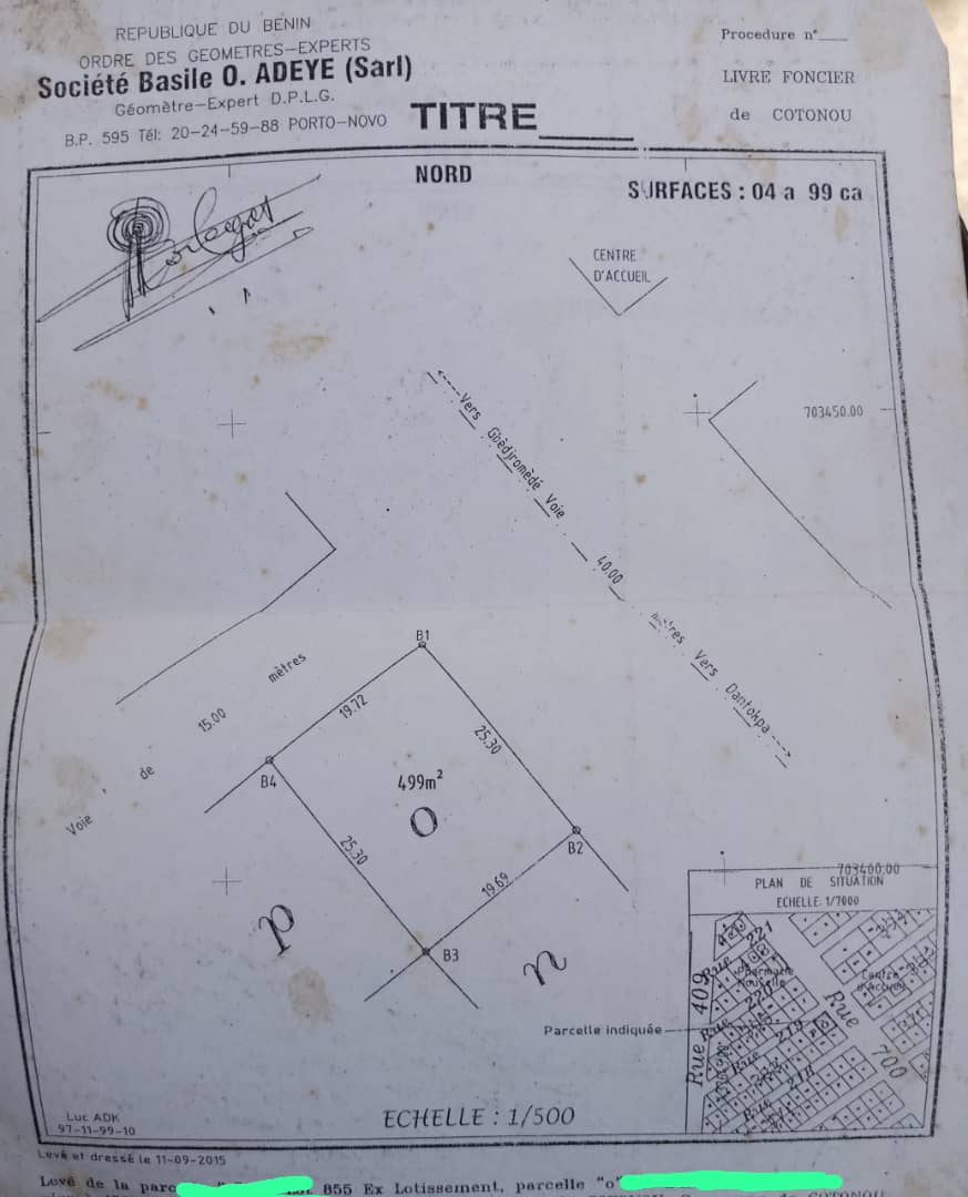 Nous mettons en vente un domaine de deux parcelles ensemble : " O" et "P" de superficies respectives : 499m² et 491m² soit au total :*990m² en angle de rue_( l'une derrière l'autre)_ sur l'axe routier à double sens, quittant le carrefour 16ampoules au carrefour du marché saint Michel , Dantokpa.